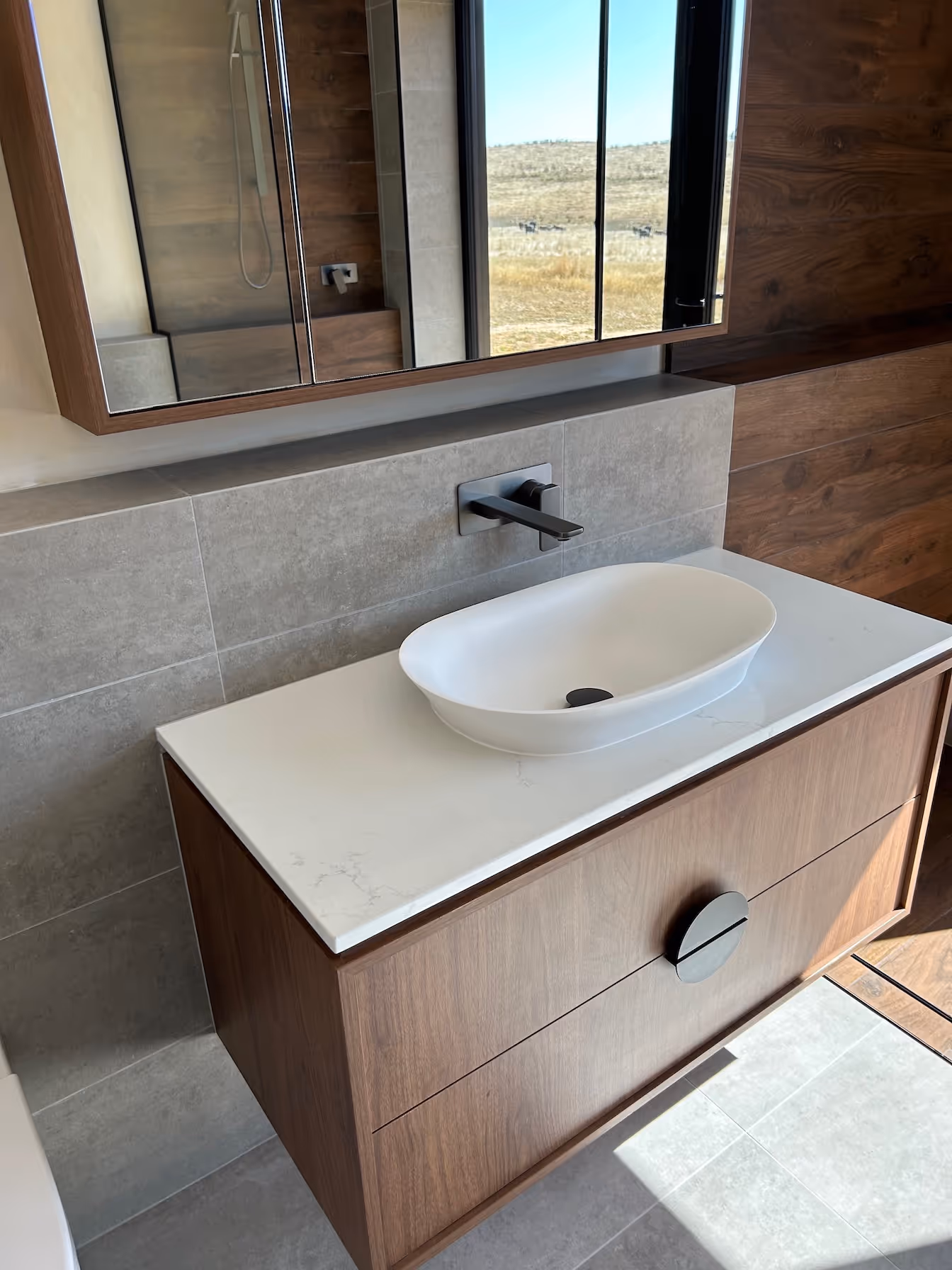 The butterfly roof makes a big design statement but in fact the clients were keen on this feature for very practical reasons, chiefly ease of cleaning. The home runs off a large kWh solar PV array and the solar panels need to be kept clean, as does guttering and the roof itself, which harvests rainwater for the off-grid home. The central box gutter provides safer passage for regular cleaning and maintenance.