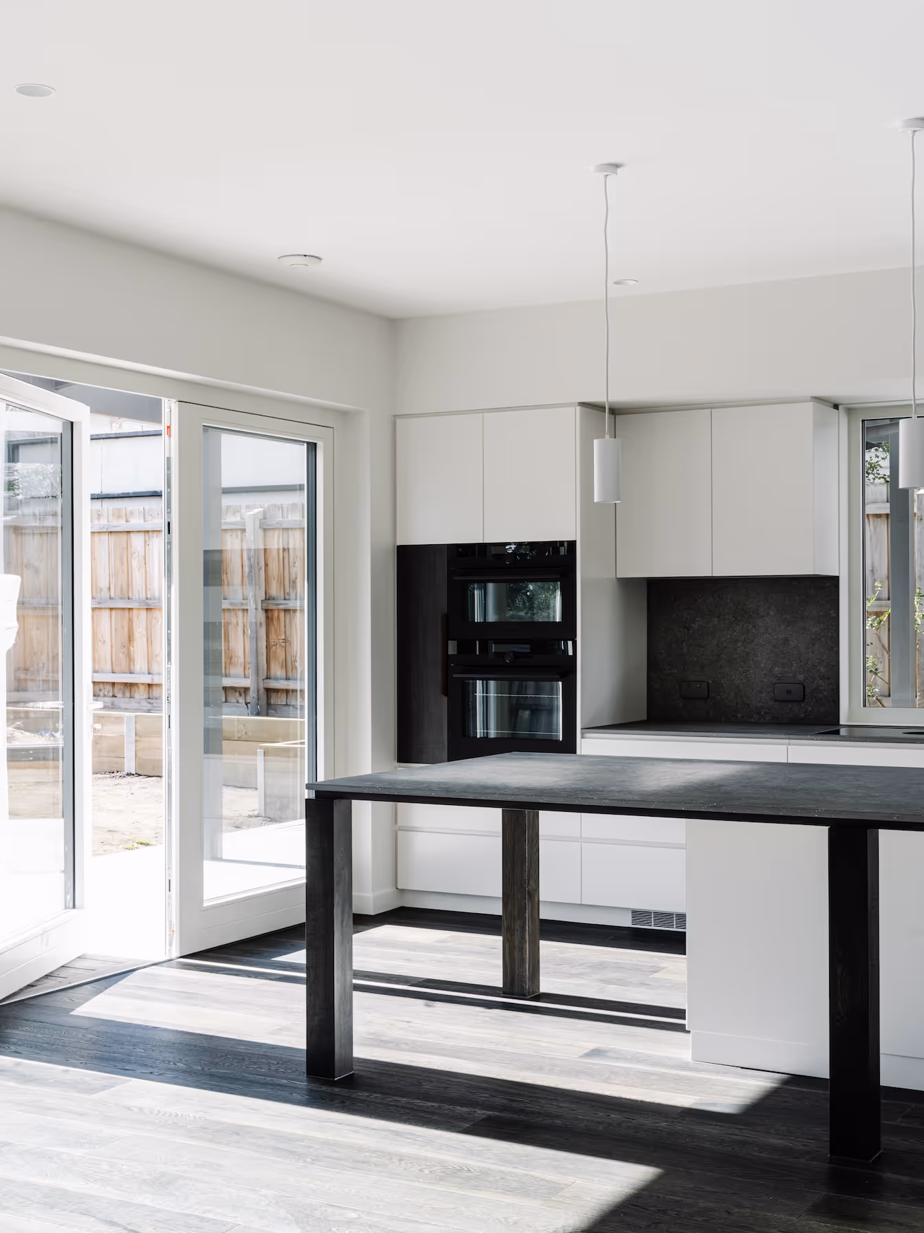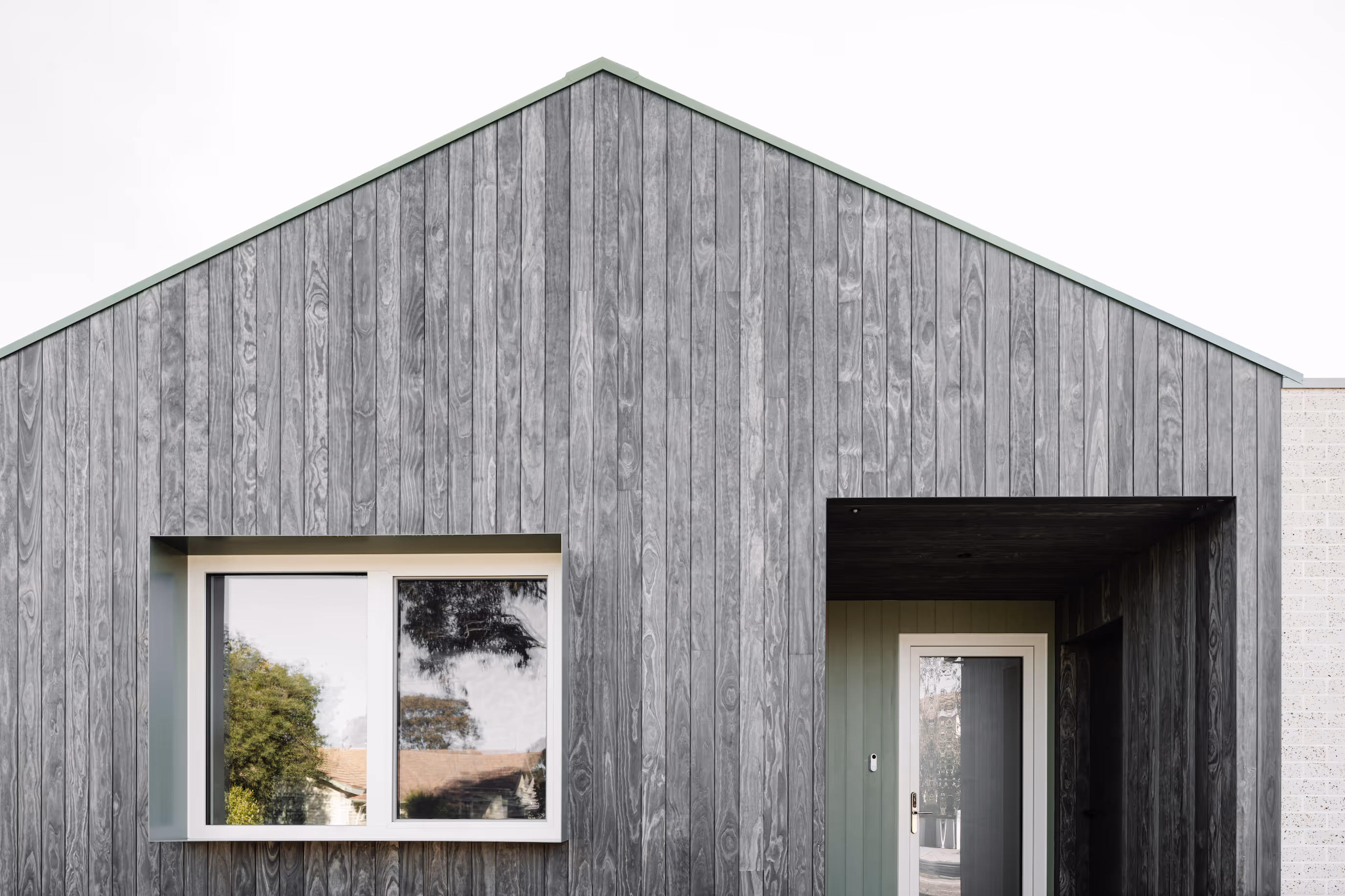 As on every Envirotecture project, materials were carefully considered with regard to sustainability, durability, functionality and aesthetics. The ground floor cladding and decks are Accoya, created by a non-toxic timber treatment that significantly improves wood hardness and stability. It’s pre-finished, requires no maintenance and has an exceptionally long lifespan. The concrete foundation uses low-carbon cement. Inside, sintered stone is used in the kitchen: safe, highly durable and long-lasting. Low-VOC paints have been specified.