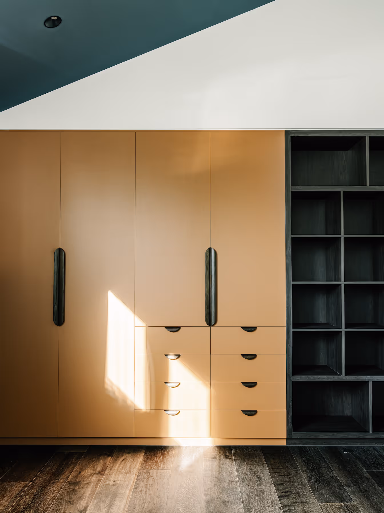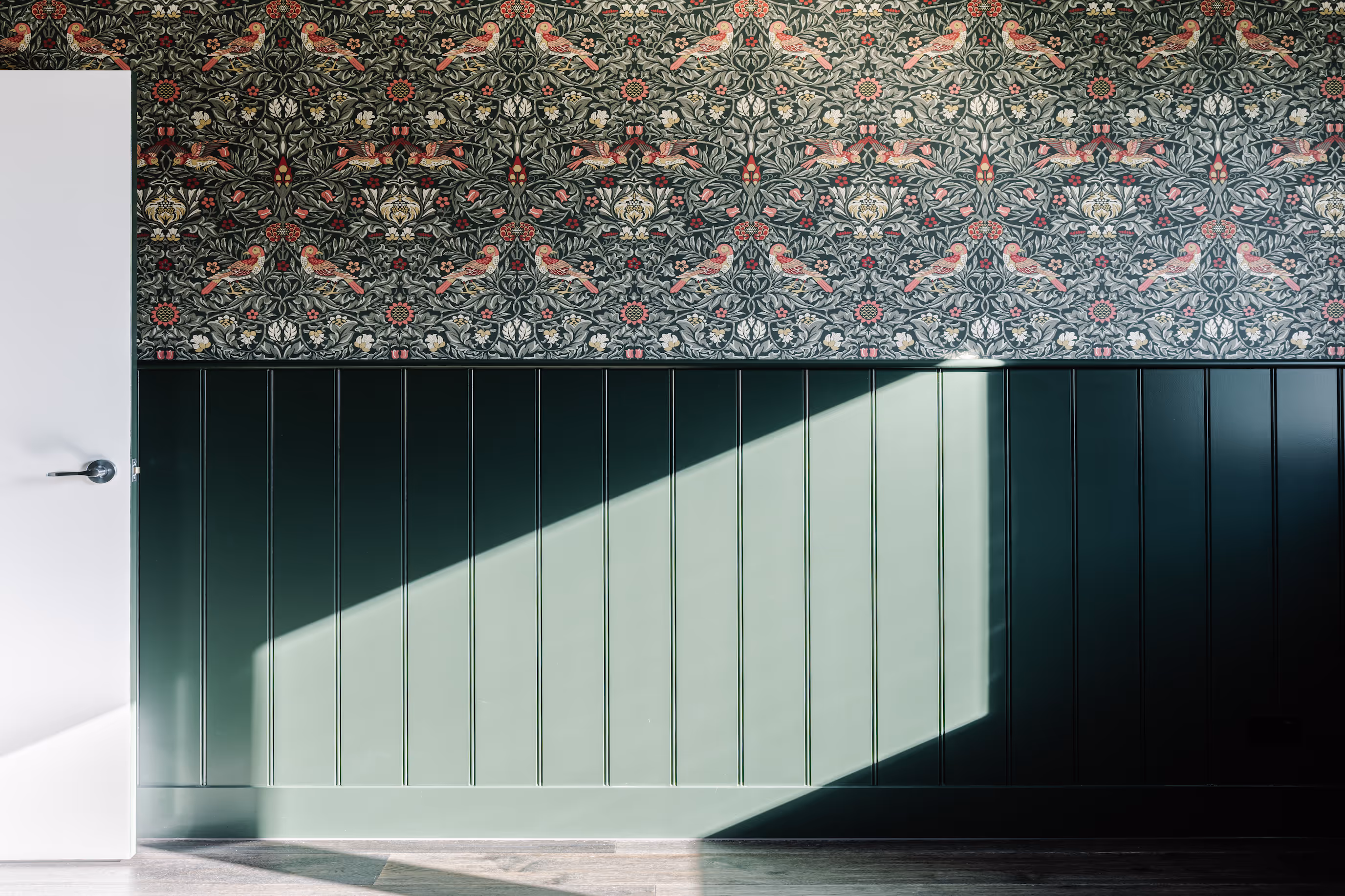 Envirotecture carried out interior design services on this project, beautifully integrated with the architectural design from the earliest stages. There is extensive custom joinery in living areas and bedrooms and storage considered down to the smallest details, like the panelled hallway with its row of coat hooks. Material choices balance budget with impact: bold pops of colour and William Morris wallpaper create rich texture in bedrooms with dramatic raked ceilings, while exquisite tiles in different colours distinguish the bathrooms.