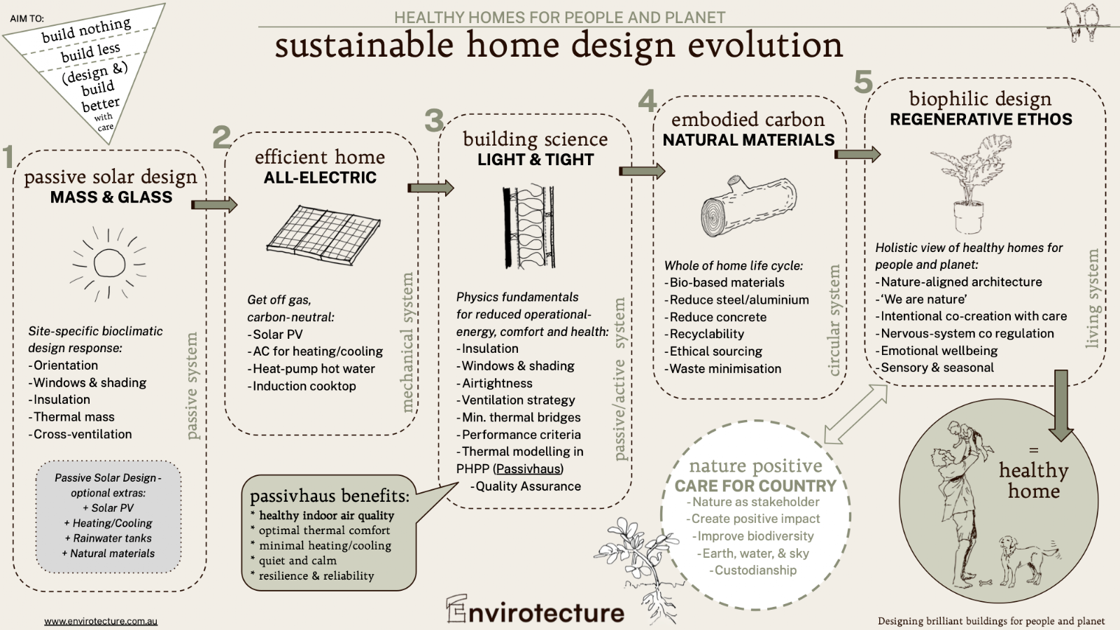 At Envirotecture, we’ve written about the evolution of sustainable design before for Sustainable House Day (and the difference/similarities between passive solar design and the passivhaus standard) but we’re increasingly discussing the benefits of biophilic design for homes that are healthy for people and planet from a more regenerative perspective. We realised that it might be helpful to put this into an infographic (without the use of AI) to explain the journey of where we started, where we are now, and where we’re headed.