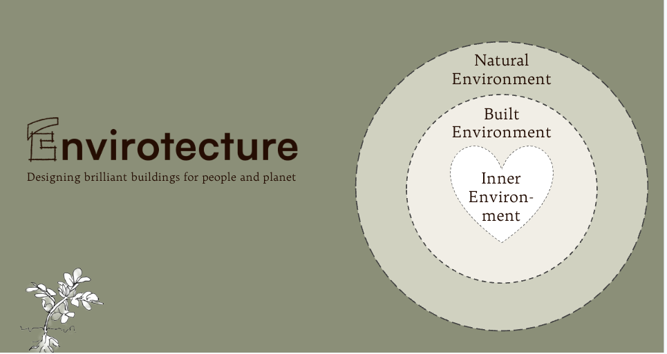 Envirotecture is not just the name of our practice, it is an ethos of our holistic design approach to designing environmental architecture, hence our tag line: “Designing brilliant buildings for people and planet.” We regularly talk about healthy homes and include this diagram to help explain the three nested concepts of home - as they are all places we dwell, and they all have a profound impact on the health of our body, mind and soul.