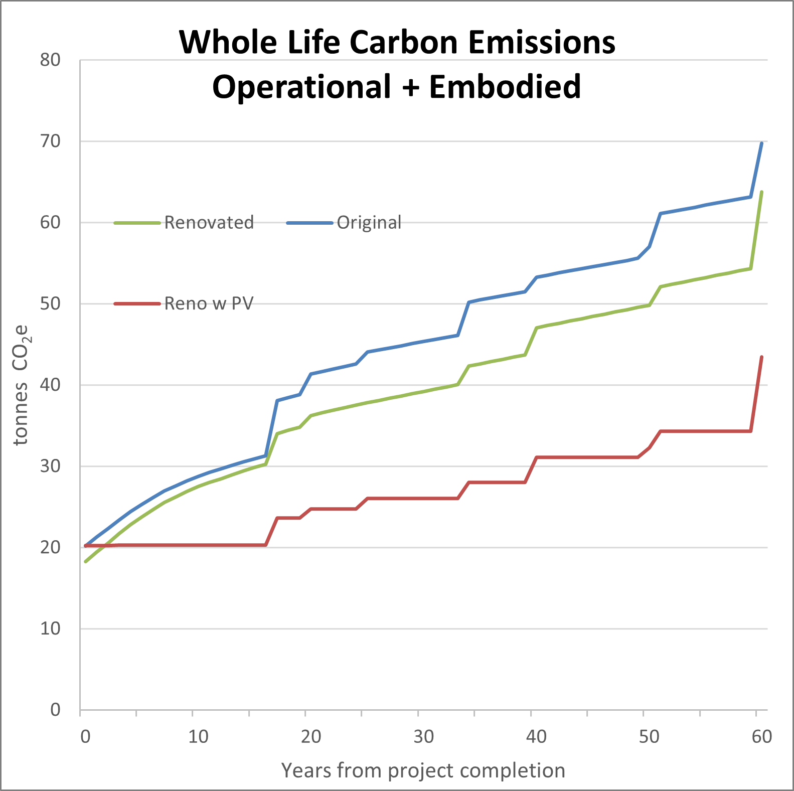 The graph below shows lifetime carbon for three scenarios for the same house (120m2) in a cold winter, warm summer non-coastal location of NSW. The key assumptions are a deep passivhaus retrofit with and without PV as well as a non-renovation option. The unrenovated version gets double the PV system in an attempt to power a 16kW air conditioning system that may or may not be able to keep you warm in a house that leaks like a sieve when it is -5ºC outside. The passivhaus retrofit has just an 8kW system (more about distribution than capacity) and just a 6kW PV system.
